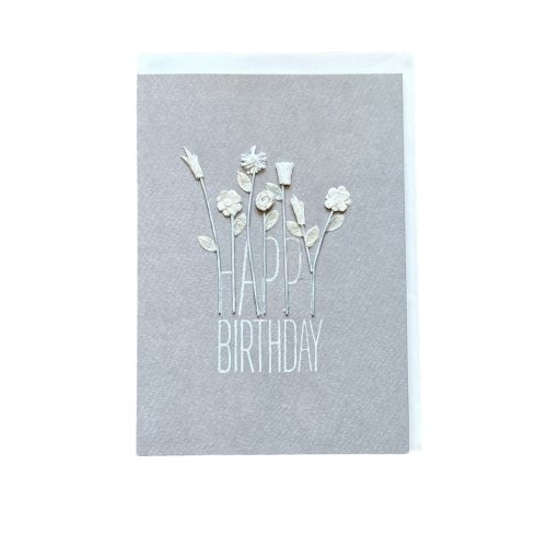 Carte grise fleurs blanches – Happy birthday