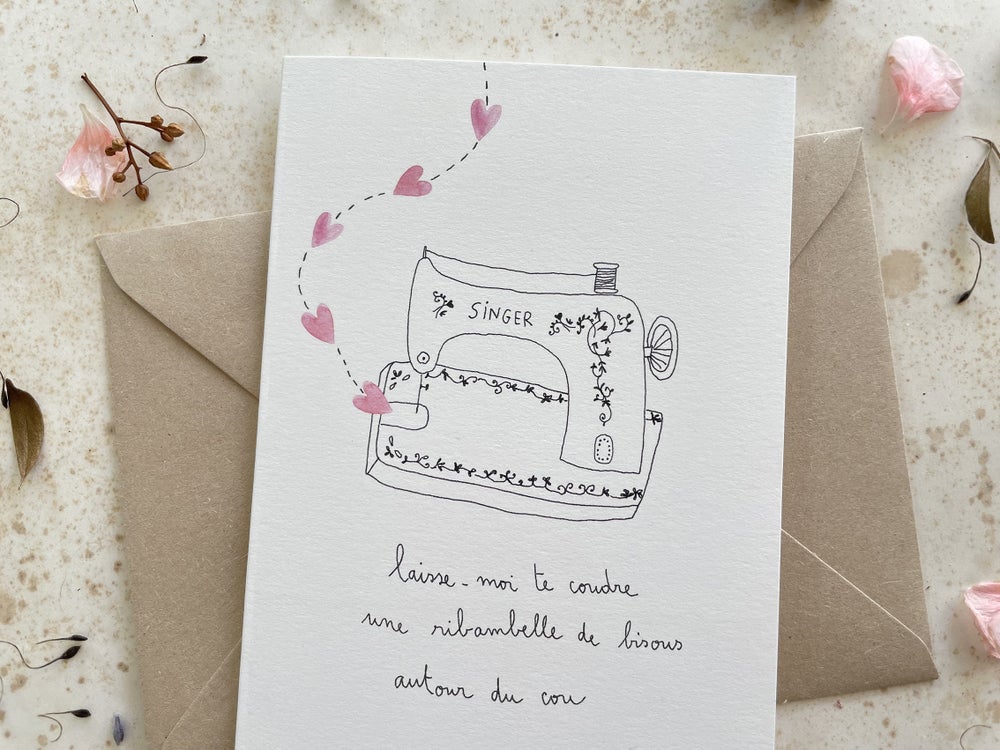 Carte Coudre “Laisse-moi te coudre une ribambelle de bisous autour du cou”
