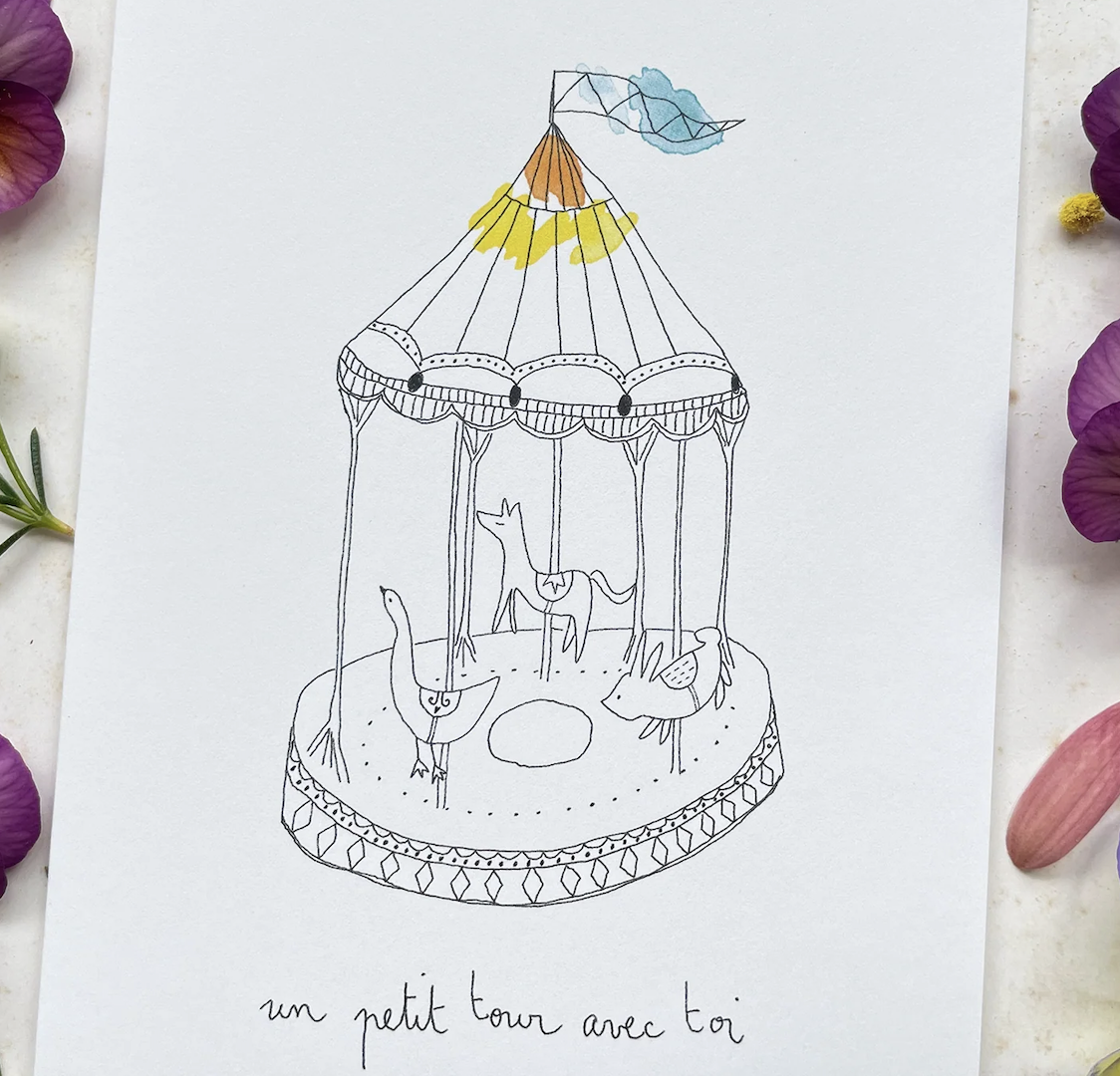 Une carte illustrée d’un manège, pour évoquer les moments légers, joyeux, un peu hors du temps. À envoyer à ceux avec qui la vie tourne juste un peu plus rond.
