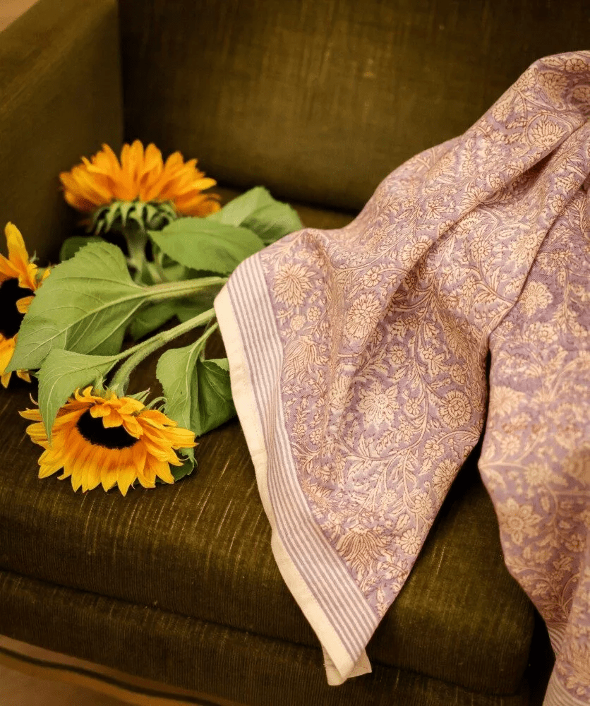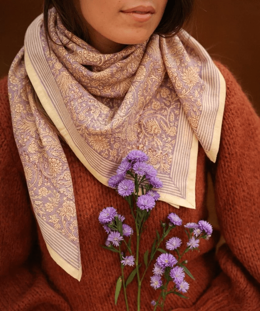 Un foulard coloré et imprimé à la main sur un tissu doux et léger, qui enveloppera votre cou pour un petit look boho-chic ! À porter autour du cou, dans les cheveux ou en ceinture. Créez votre mix and match avec le petit foulard Anjali Lilas !