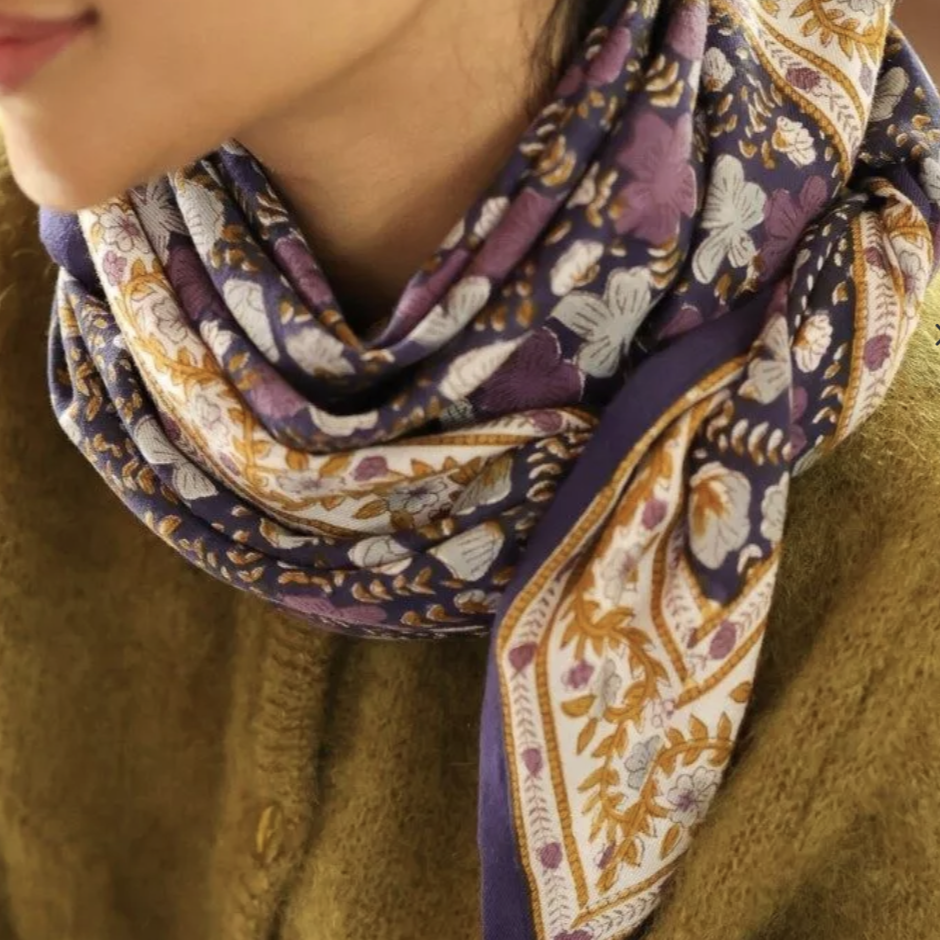 Un foulard coloré et imprimé à la main sur un tissu doux et léger, qui enveloppera votre cou pour un petit look boho-chic ! À porter autour du cou, dans les cheveux ou en ceinture.
