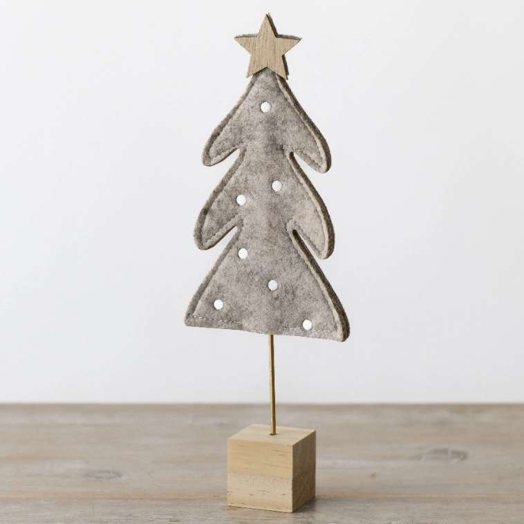 Imaginez votre décoration de Noël avec ce sapin fabriqué en feutrine grise, élégant et festif, apportant une touche de chaleur et de simplicité. Le sapin a une forme classique et il composé essentiellement de feutrine pour donner du volume à cet objet décoratif. En haut de ce petit sapin se trouve une étoile en bois naturel, ajoutant une touche rustique et authentique. Il trouvera sa place dans votre décoration de Noël, sur une console, au bord d’une cheminée ou en centre de table.