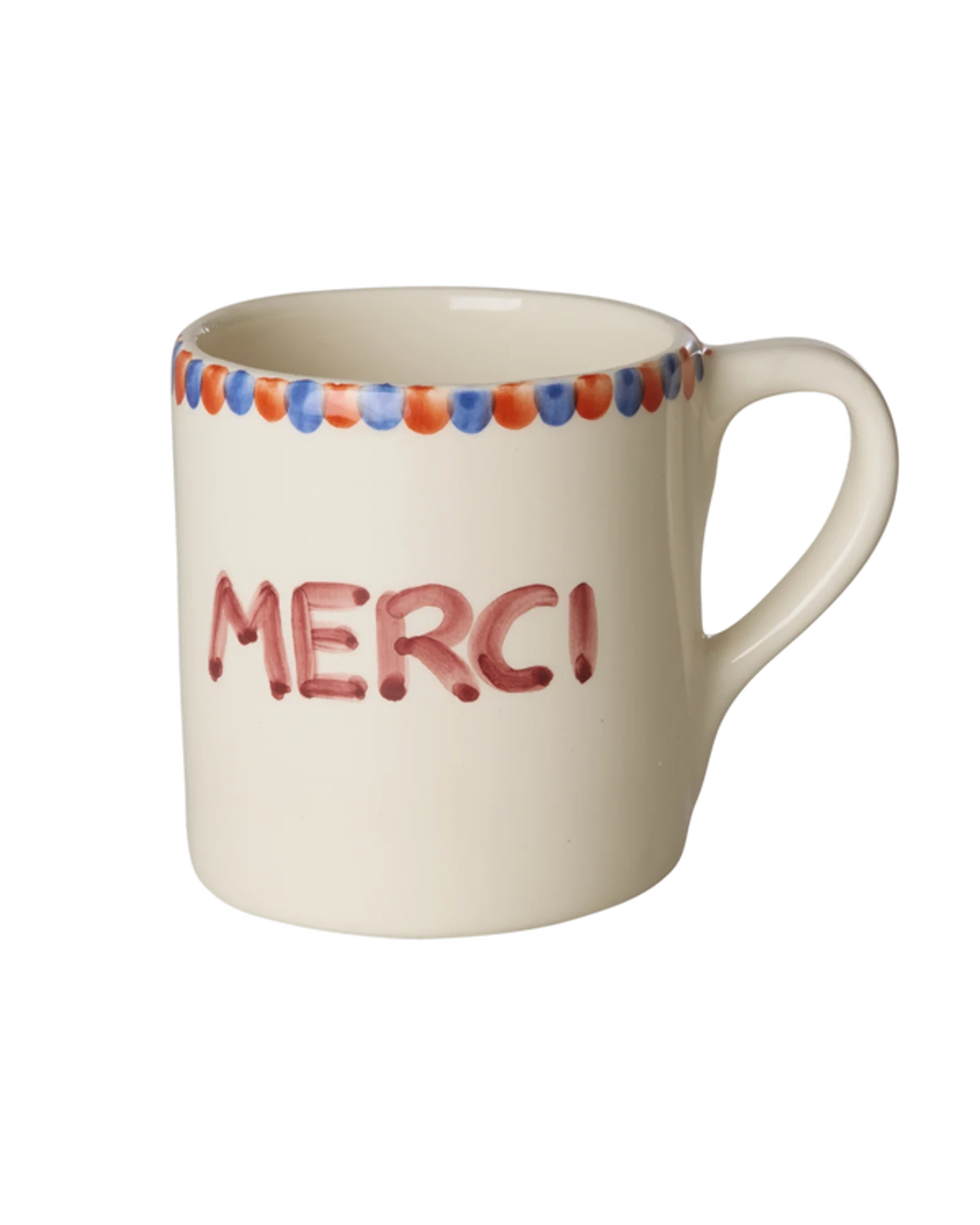 Magnifique mug pour le café avec un bord décoré de jolis pois et portant l’inscription « Merci ». Peint à la main au Portugal par un groupe de femmes extraordinaires, c’est une pièce vraiment unique et remplie de charme !