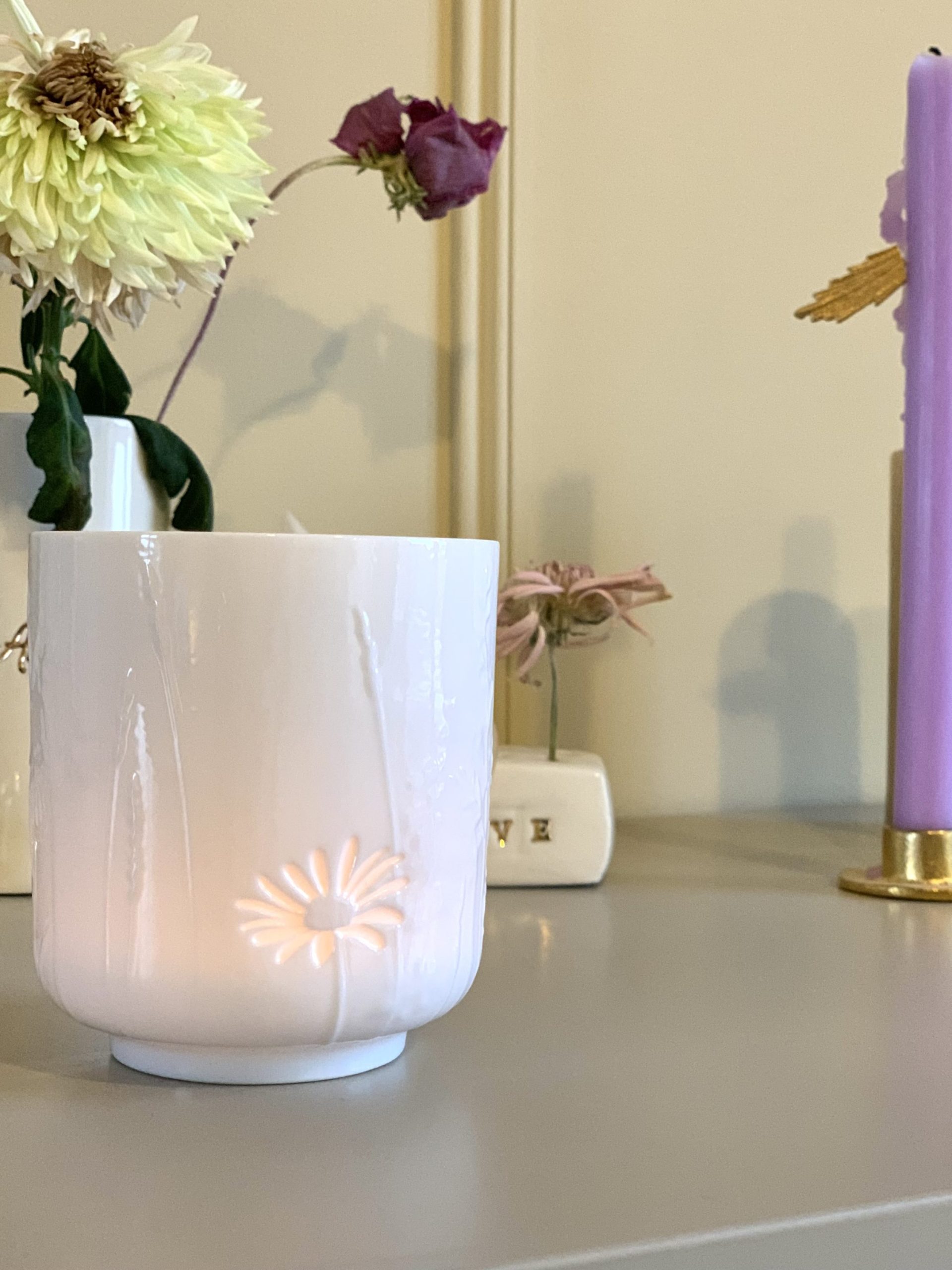 Joli photophore en porcelaine. Ce photophore en porcelaine sera encore plus beau une fois allumé et procurera une lumière délicate et chaleureuse pour une ambiance cosy, à déposer sur le rebord d’une fenêtre, sur un buffet…