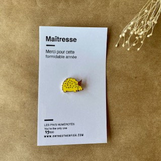 Pin’s émaillé numéroté hérisson pour célébrer la fête fin d’année scolaire. Because, you’re the only one ! À porter sur un t-shirt, sur un pull ou à accrocher par milliers sur vos tote-bags, la maîtresse de votre petit bout va adorer, aussi bien le pins que le joli mot!