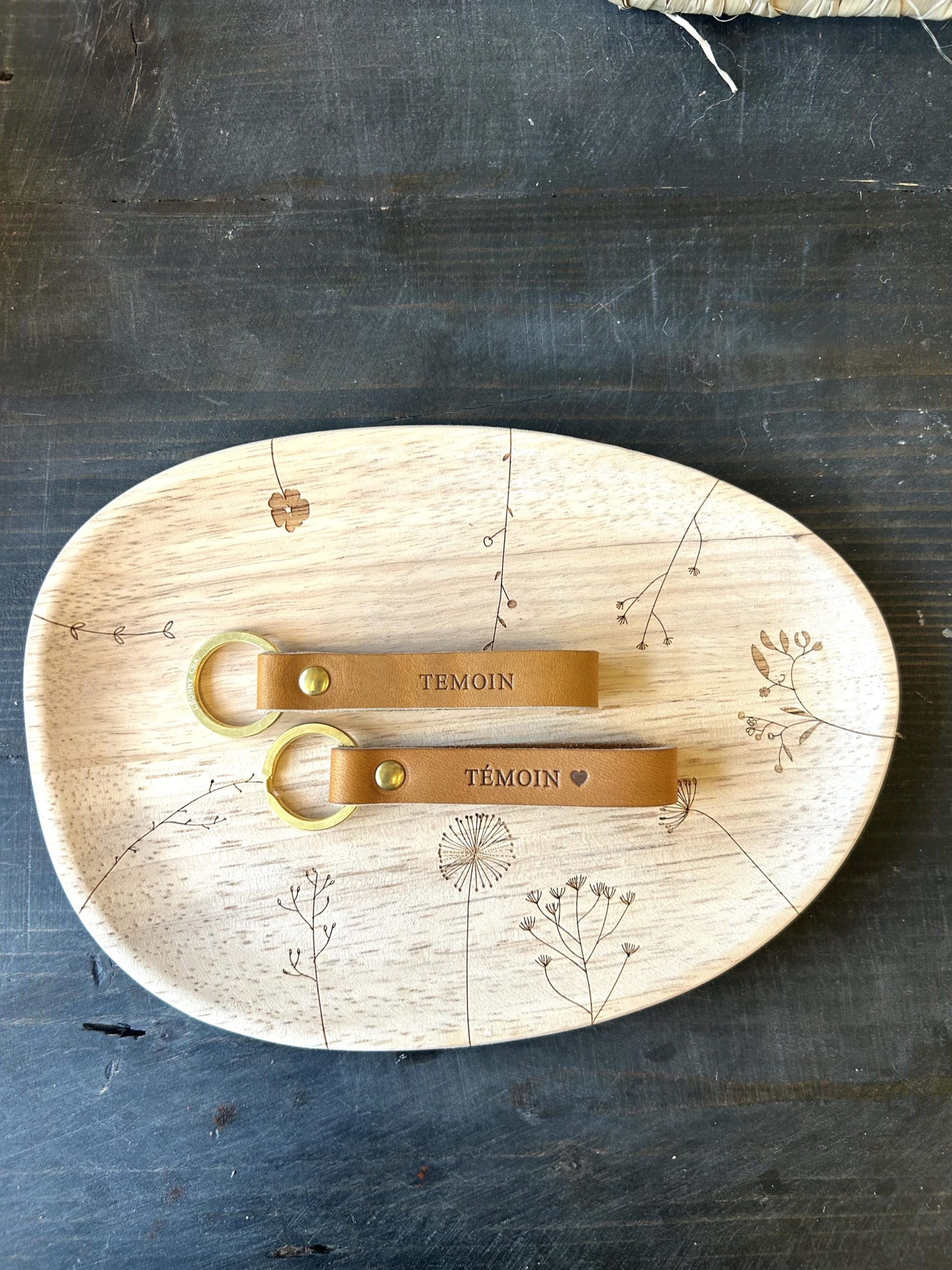 - Porte clés en cuir, gravés à la main.
