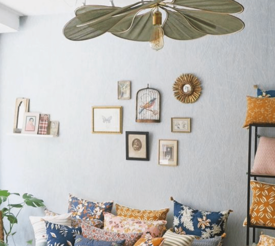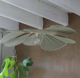 Cette suspension en forme de fleur joue subtilement avec la lumière, diffusant une clarté douce dans la pièce et des jeux d’ombres délicats au plafond.