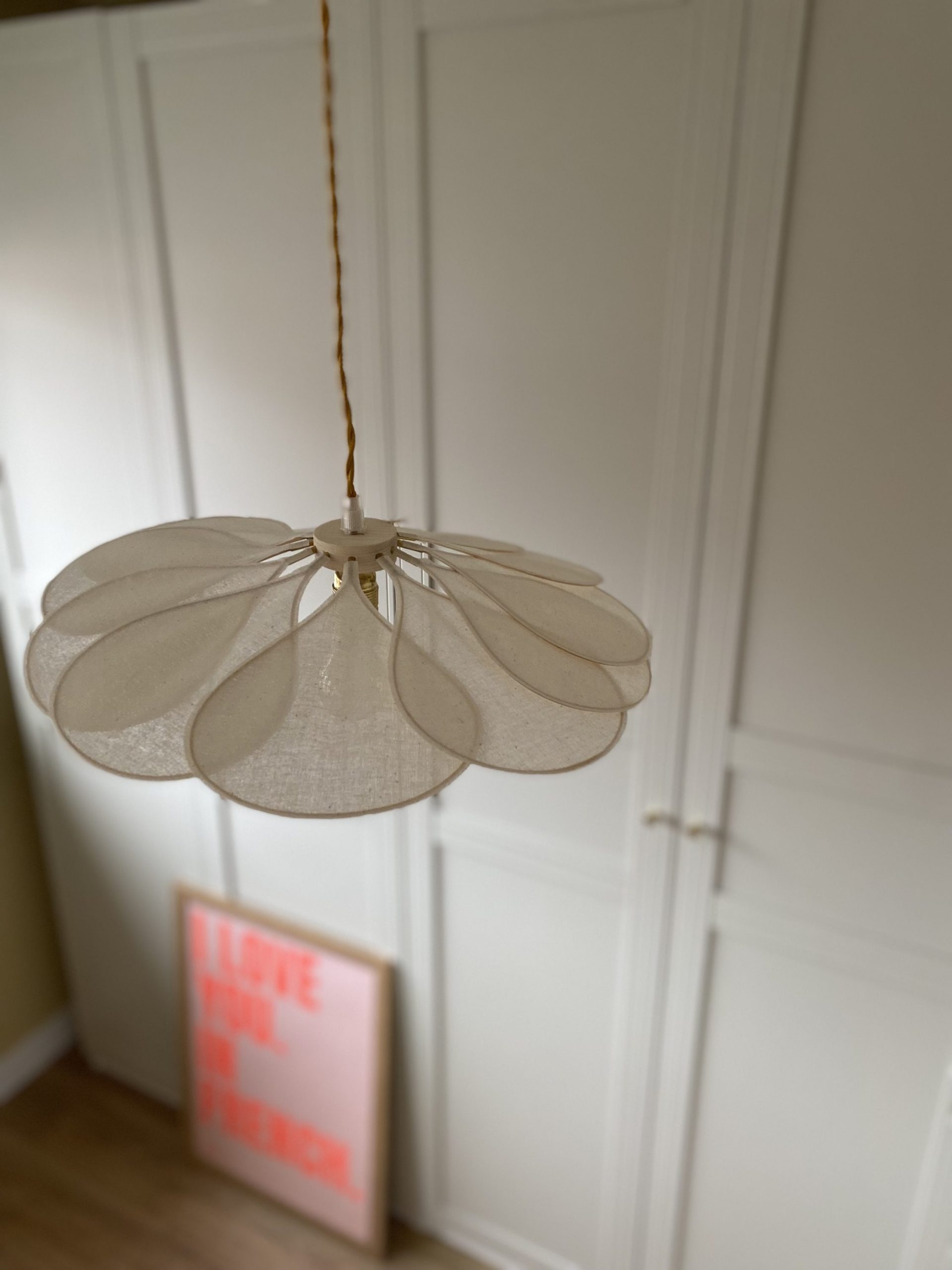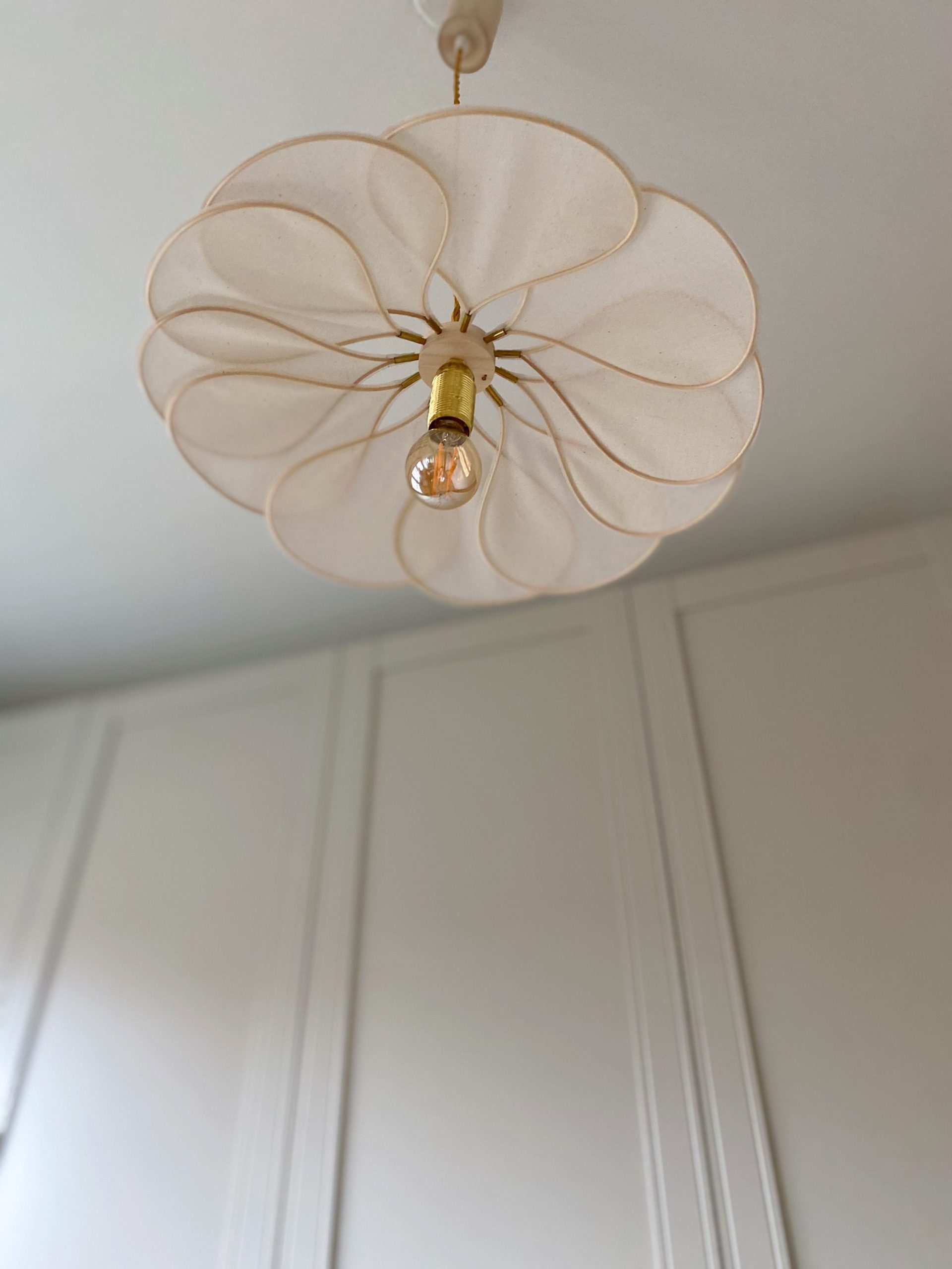 Cette suspension en forme de fleur joue subtilement avec la lumière, diffusant une clarté douce dans la pièce et des jeux d’ombres délicats au plafond. Cette pale XS trouve son emplacement aisément dans une entrée, une petite chambre d’enfant ou au dessus d’un bureau.