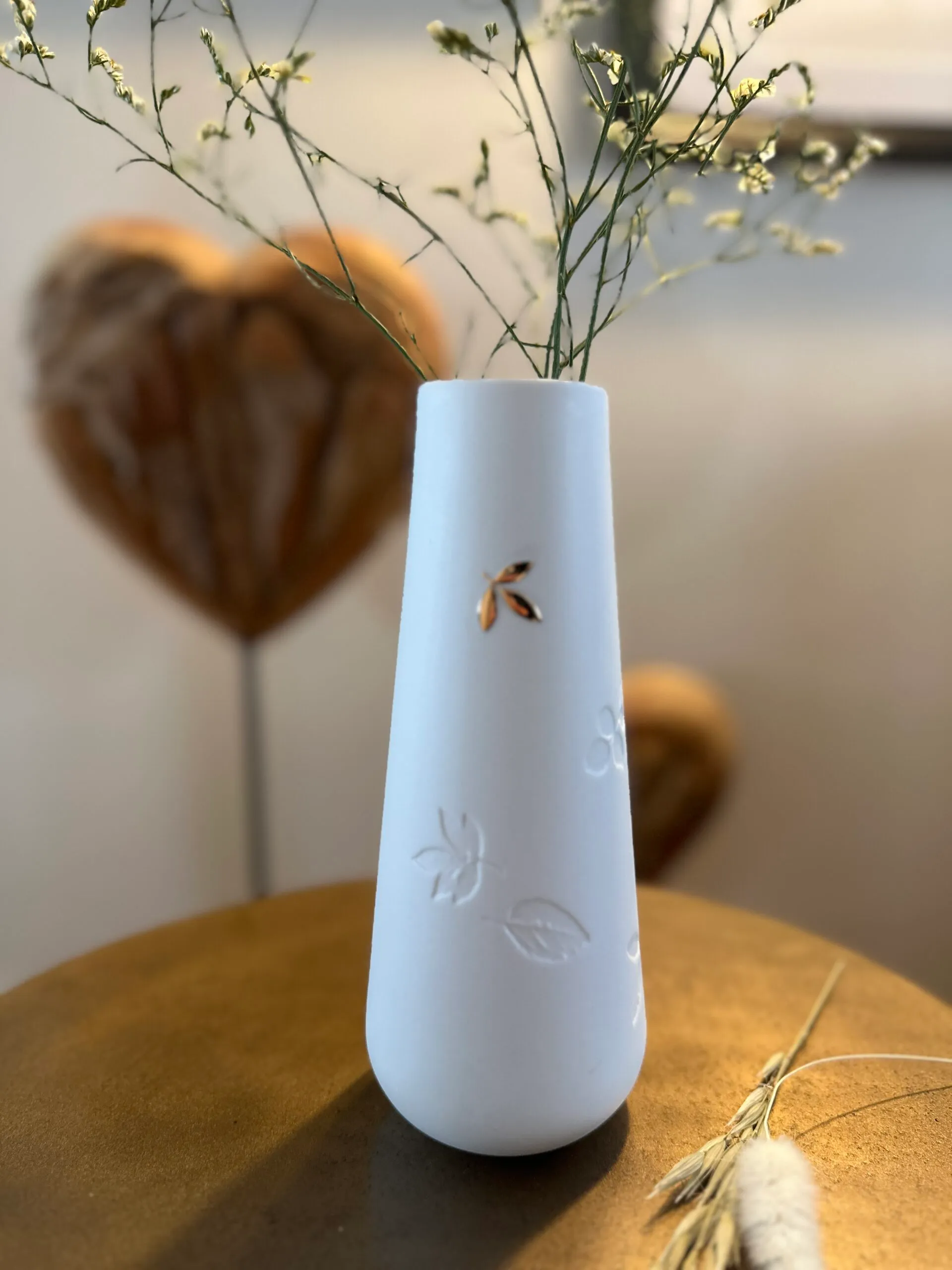 Vase en porcelaine blanche, détail de feuillage en relief et jolie feuille dorée. C’est LE vase à avoir chez soi ou le cadeau parfait à offrir, un bon basique tout en délicatesse.