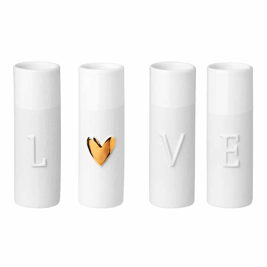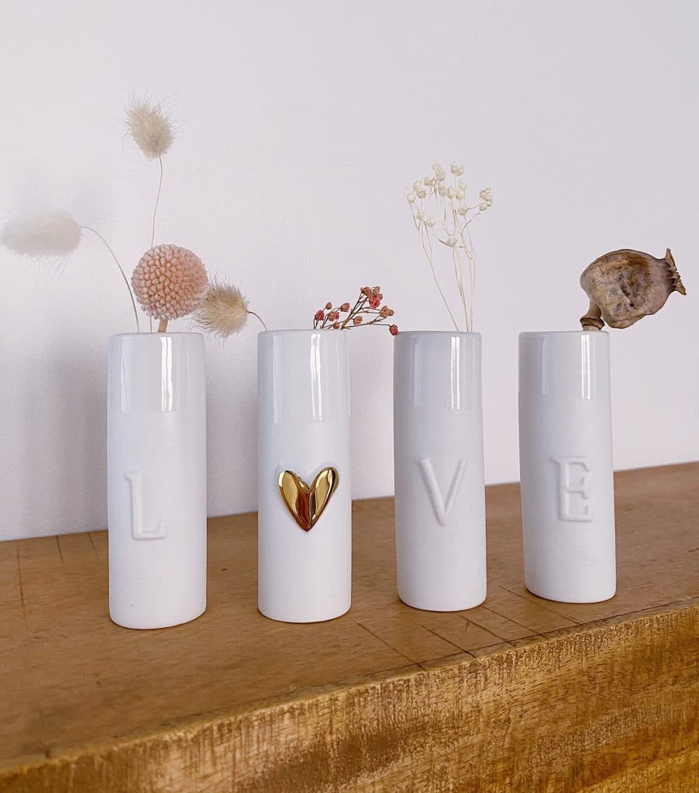 Set de 4 petits vases soliflores en porcelaine. Leur design sobre et épuré, agrémenter de petites fleurs, sera la petite touche d’amour parfaite pour votre intérieur. Inscription « Love » en relief (avec cœur doré).